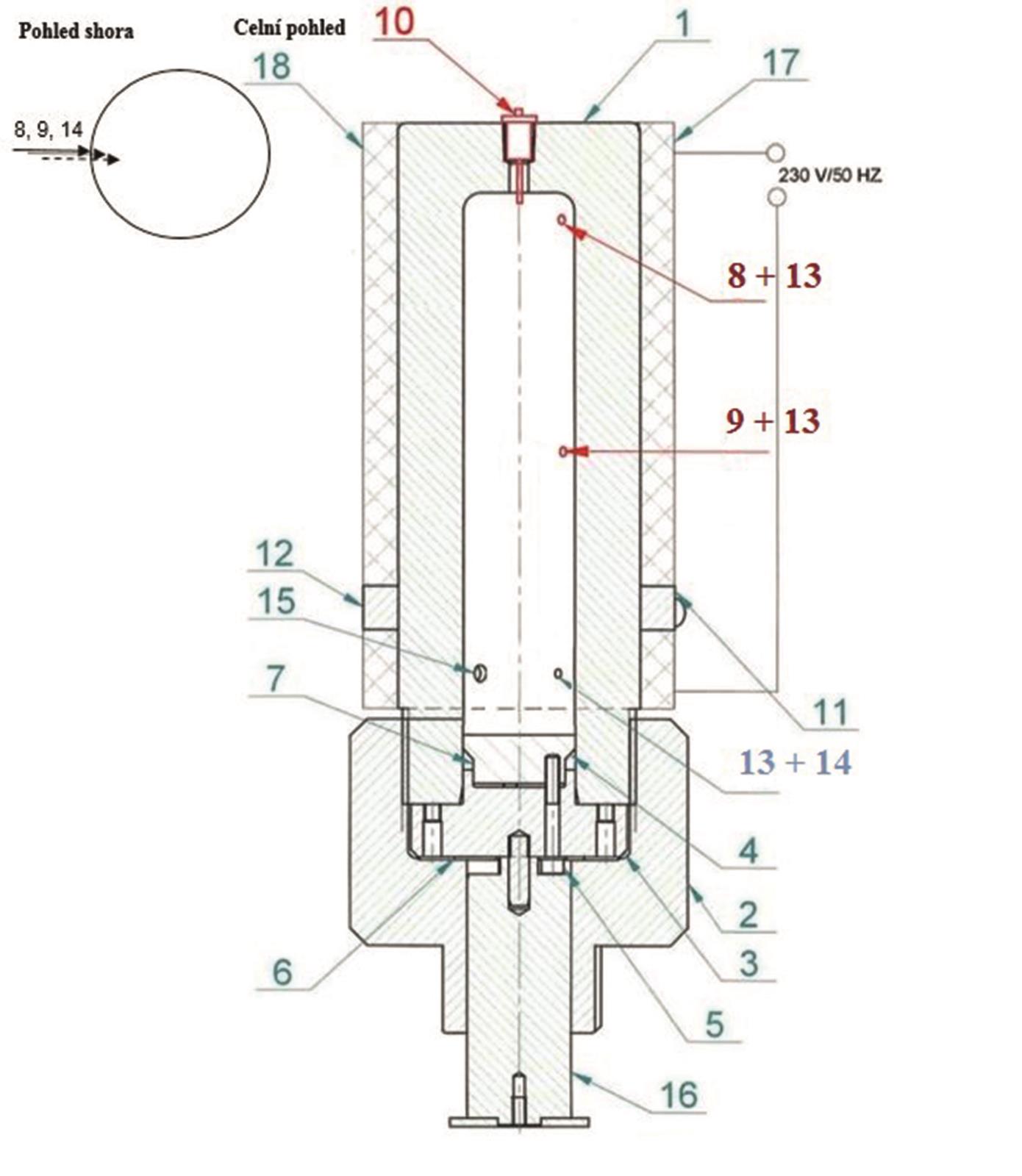 Obr. 1 Zkušební nádoba Vysvětlivky: 1 - válcovitá silnostěnná nádoba, 2 - převlečná matice na závit, 3 - víko, 4 - vnitřní víčko, 5 - šroub, 6 - měděná podložka, 7 - grafitové lichoběžníkové těsnění, 8 - termočlánek měřící teplotu v horní části nádoby, 9 - termočlánek měřící teplotu ve středu nádoby, 10 - vstup pro HPLC čerpadlo, 11 - jistící průtržná membrána, 12 - kulový ventil, 13 - termojímka k utěsnění termočlánku, 14 - termočlánek měřící teplotu v dolní části nádoby, 15 - snímač výbuchového tlaku, 16 - píst, 17 - elektrické návlekové pouzdro, 18 - tepelně izolační plášť zkušební nádoby.