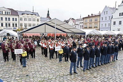 Hasičské hudby a noví příslušníci HZS kraje VysočinaPublikum na pelhřimovském Masarykově náměstí přivítali hejtman kraje Vysočina Jiří Běhounek, starosta města Leopold Bambula a generální ředitel HZS ČR genmjr. Miroslav Štěpán. Poté již na deštěm zkrápěnou dlažbu za zvuku řízných skladeb napochodovala jednotlivá hudební tělesa: mažoretkami doprovázená Opočenka Václava Lepše, Hasiči Přibyslav za řízení Václava Paličky, hasičská muzika Nová Bystřice s Karlem Loskotem, Hudba při HZS Olomouckého kraje vedená Jiřím Pavlíčkem, jihočeští Božejáci Pavla Skalníka, valašská Lidečanka s kapelníkem Radimem Slovákem, Dychovka Tvrdošanka Dolný Kubín ze Slovenska a Městská hudba St. Valentin z Rakouska.