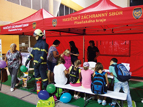 Mezi pozvané návštěvníky akce patřili také žáci základních škol především z Plzně a nejbližšího okolí. V našem preventivně výchovném stánku jsme se je snažili oslovit s problematikou ochrany člověka za běžných rizik a mimořádných událostí, která je součástí základního vzdělávání. Žáci prvního stupně si mohli prakticky vyzkoušet přípravu táborového ohně, přitom si museli připomenout všechny zásady, které je potřebné dodržovat k tomu, aby nebyl způsoben požár. Dalšími náměty na ověření znalostí žáků bylo doplňování vhodných čísel tísňových linek do obrázků s méně či více závažnými situacemi nebo si mohli vyzkoušet simulované volání na tísňovou linku. Pro žáky druhého stupně jsme měli připravenou hasičskou doplňovačku s tajenkou (viz následující strana), která ověřovala základní znalosti z ochrany obyvatelstva a požární prevence.