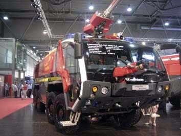 Jeden z dominantních exponátů - letištní automobil PANTHER typ CA7 8x8 firmy RosenbauerExpozice rakouské firmy Rosenbauer potvrdila reprezentativním výběrem exponátů vystavených na ploše 5000 m2, že jde v současné době o největšího výrobce požárních automobilů na světě. Z mnoha novinek stojí za pozornost představení konceptu požárních automobilů AT, který po třetí modernizaci zahrnuje 90 dílčích zlepšení. Jako ústřední exponát byl prezentován požární automobil HLF 20/16 na podvozku MAN TGM s motorem o výkonu 213 kW v provedení AT-pokročilá technologie. Kabina pro osádku je oddělená. Dveře kabiny jsou standardní otočné se spodním dílem usnadňujícím vystupování osádky. Čerpací zařízení s kombinovaným čerpadlem typu NH35 je plně automatické. Ovládá se z displeje, na kterém jsou zobrazeny všechny provozní stavy. Nádrž na vodu o objemu 2400 l je z jednoho kusu. Tyto parametry jsou známé od roku 2004, kdy byla představena druhá modernizace systému AT. Tento zásahový automobil přesto stále přitahuje zvýšenou pozornost, a to z důvodů do detailu propracované ergonometrie a bezpečnosti. Novinkou je osvětlení LED diodami a hybridní systém řízení zásobování elektrickou energií. Pro AT řadu je typická i AL stavebnice účelových nástaveb. Ve stejném provedení se dodávají typy RLFA 3000, LF 10/6 a TLFA 5500/400. Elektronické zpracování informací v různých formách využívají i další výrobci zásahových automobilů jako firmy Ziegler nebo IVECO Magirus. Zda jde především o marketingové důvody, prověří až praxe, která diktuje nejen uživatelský komfort, ale i spolehlivost nasazení.
