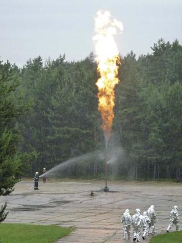 Průběh cvičeníPodzemní zásobník plynu je malá továrna, jejíž technologie zabírá několik hektarů. Patří k ní např. zařízení pro separaci (odvodnění ložiskové vody) a ohřev plynu (zvýšení teploty plynu před snížením jeho tlaku), sušení plynu (odstraněním vodních par z plynu), filtry pro čištění plynu, tlačné a těžební sondy a sběrná střediska s měřicími a regulačními zařízeními pro měření různých parametrů a množství plynu vstupujícího do zásobníku nebo z něj dodávaného do přepravní soustavy. Tomuto zařízení se samozřejmě nevyhýbají poruchy a havárie a k úspěšnému řešení takových mimořádných situací jsou pravidelně pořádána součinnostní cvičení.