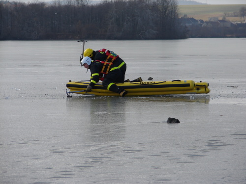 Až dvacet centimetrů silný led hlučínské štěrkovny (okres Opava) umožňuje i na přelomu února a března s teplotami nad nulou výcviky profesionálních hasičů z Ostravy, zaměřené na záchranu osob na vodě a zamrzlé hladině. Takto se například připravovala na ostré zásahy ve středu 29.2.2012 odpoledne směna C ze dvou ostravských stanic Hasičského záchranného sboru Moravskoslezského kraje (HZS MSK).
