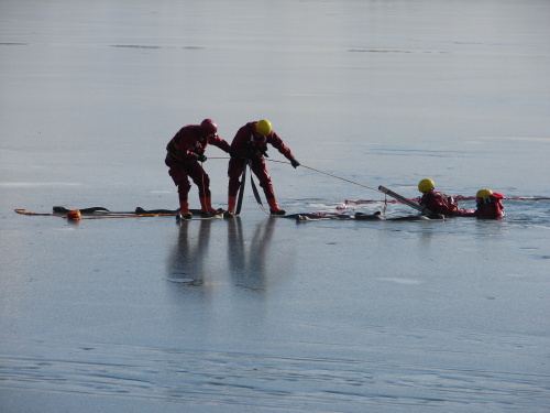 Vyzkoušeli si mj. pohyb na ledu jak bez technických prostředků, tak pohyb se záchrannými saněmi RS5 a s hliníkovým žebříkem na ledě, když se odráželi cepíny. V ledové vodě si vyzkoušeli delší pobyt, aby se co nejlépe vžili do role zachránců i zachraňovaných, a hlavně trénovali záchranu tonoucích různými způsoby - pomocí lana, žebříku i hasičské hadice.