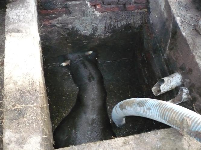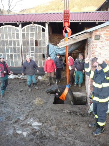 Na apríla vytahovali hasiči ze žumpy býka Bobíka