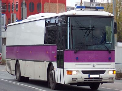 Bílý autobus s fialovým pruhem a modrými majáky parkoval ve dnech 30. a 31. ledna v areálu Školního a výcvikového zařízení HZS ČR v Brně.