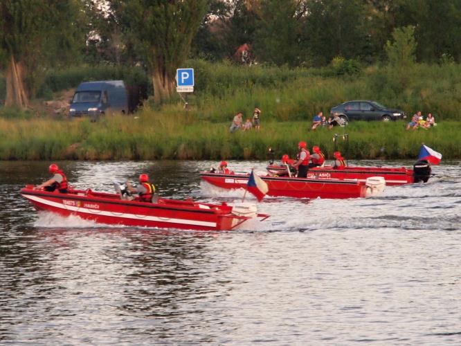 ukázky speciální techniky sloužící hasičům pro zásahy na vodě. Na Lodním náměstí probíhaly ukázky probíhaly ukázky záchrany osob z vody, plavba soulodí obojživelných pásových transportérů PTS nebo hašení pomocí „bambi“ vaku s nabíráním i shozem do Labe.