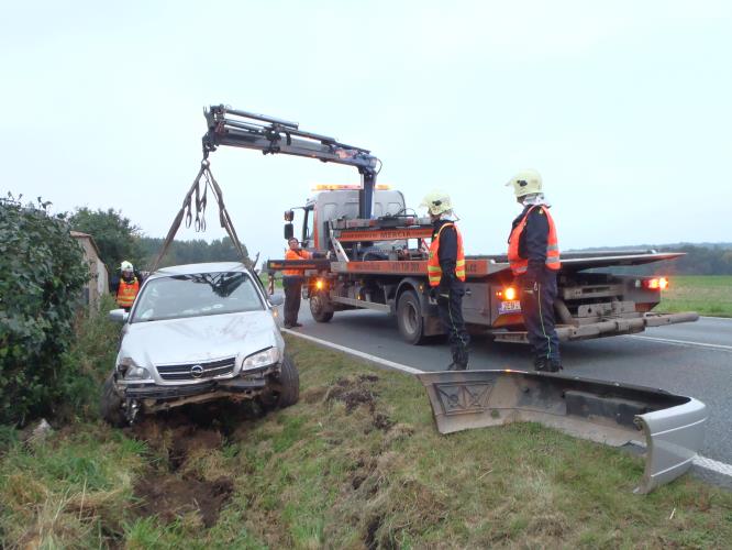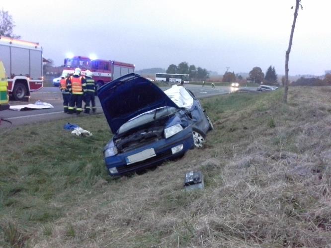 příjezdu hasičů na místo bylo zjištěno, že se osobní automobil po nárazu do propustku nachází v příkopu a na střeše. Osoby byly již mimo vozidlo. Hasiči poskytli první před lékařskou pomoc a dále zajistili vozidlo proti požáru, pohybu i úniku provozních náplní. Hasiči po příjezdu posádky zdravotnické záchranné služby asistovali při ošetřování zraněné celé posádky vozu a transportovali zraněné na nosítkách scoopram do sanitních vozů. Nutné bylo i řídit dopravu v místě nehody. Na místo byl povolán i vrtulník Letecké záchranné služby, který nakonec ale odletěl prázdný. Po příjezdu odtahové služby byl vyproštěn havarovaný automobil, otočen zpět na kola a naložen na odtah. Hasiči následně odstranili uniklé látky z poškozeného motoru a poté se vrátili zpět na základny.