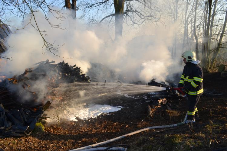 Požár přivolání hasiči uhasili dvěma vodními proudy a hromadu dřeva poté rozebrali.
