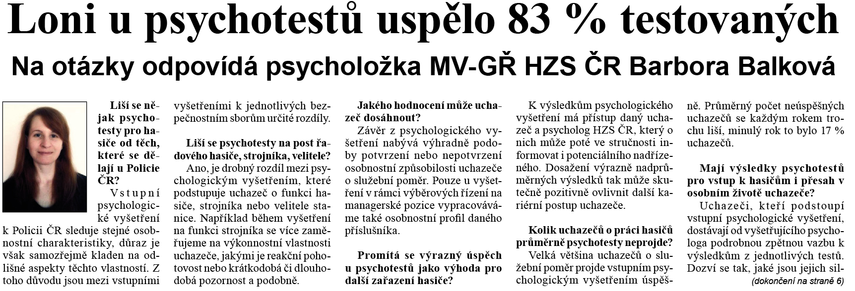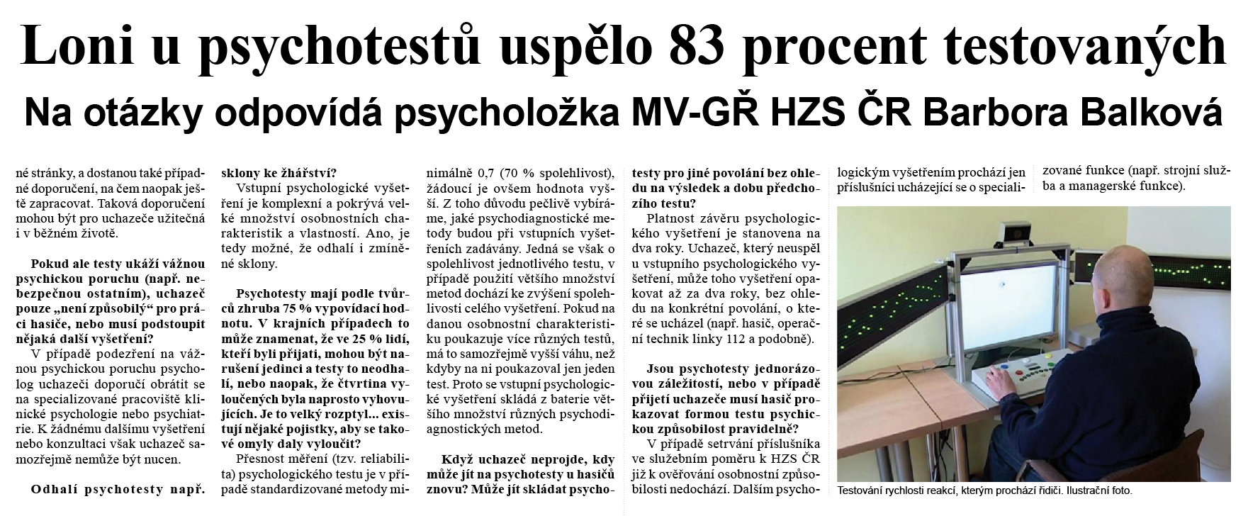 27. února 2015 otiskly Hasičské noviny ve svém čtvrtém čísle rozhovor s psycholožkou MV-GŘ HZS ČR Mgr. Barborou Balkovou na téma psychodiagnostického vyšetření u HZS ČR. Celý rozhovor lze stáhnout po kliknutí na níže uvedené odkazy.