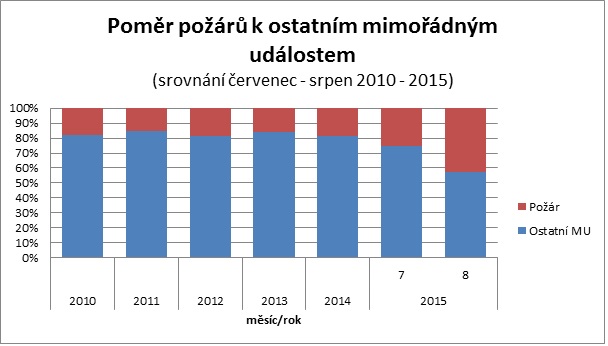Poměr událostí je v srpnu 2015 aktuální ke dni 12. 8., výsledný počet požárů vzhledem k dalším mimořádným událostem se ještě může změnit.
