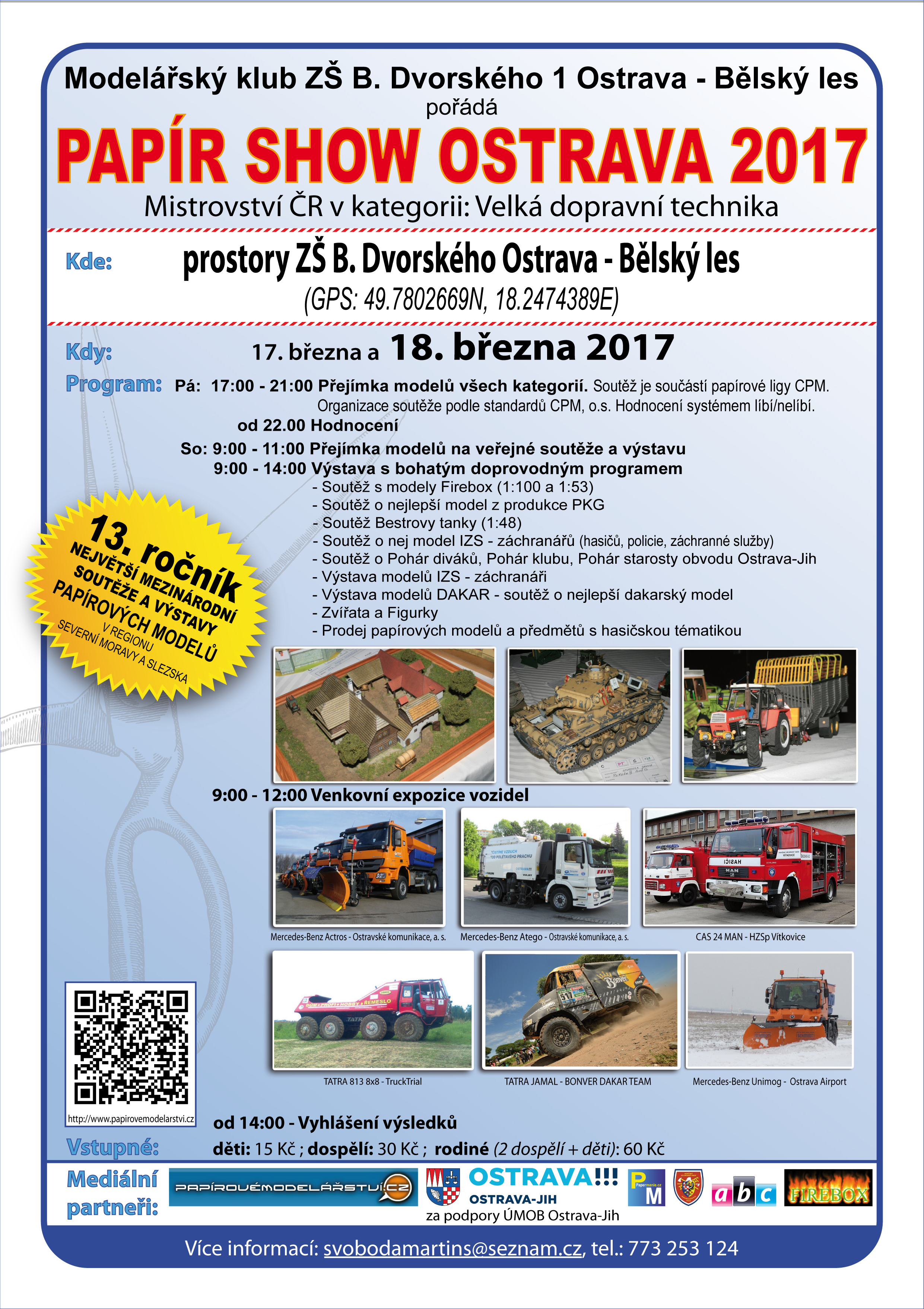 Stovky modelářů a autorů papírových „vystřihovánek“ z České republiky, ale také ze Slovenska, Polska a dalších evropských zemí očekávají v sobotu 18.3.2017 organizátoři 13. ročníku mezinárodní soutěže a výstavy papírových modelů „Papír Show 2017“ v Ostravě. Koná se potřetí na stejném místě - v prostorách Základní školy Bohumíra Dvorského v Ostravě-Bělském lese.