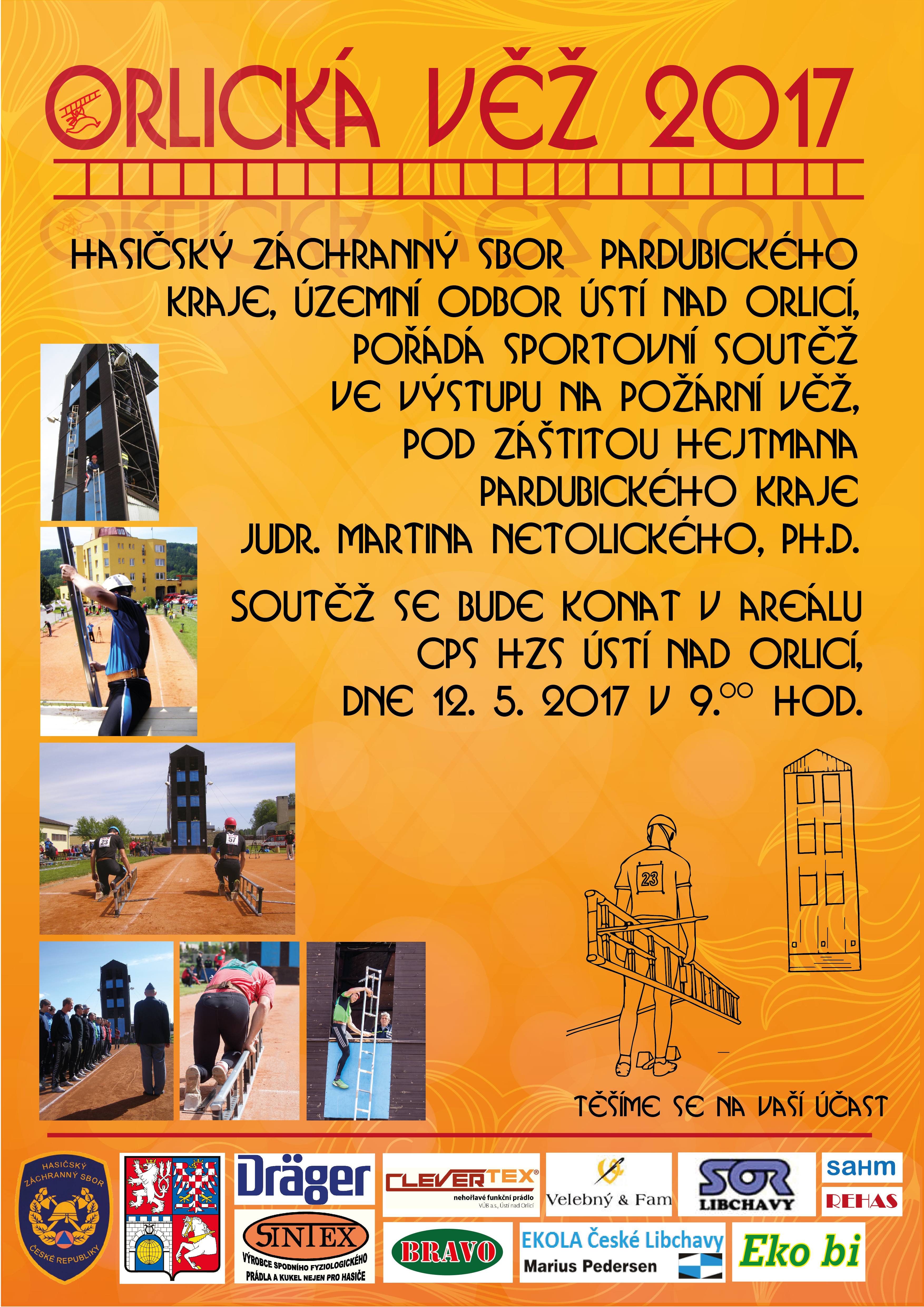 Již tento pátek 12. května 2017 se na HZS Pardubického kraje územním odboru Ústí nad Orlicí koná již XXVII. ročník soutěže Orlická věž. V areálu hasičské stanice se soutěží v disciplíně požárního sportu, a to ve výstupu na cvičnou věž pomocí hákového žebříku. Akce je pod záštitou hejtmana Pardubického kraje JUDr. Martina Netolického, Ph.D.