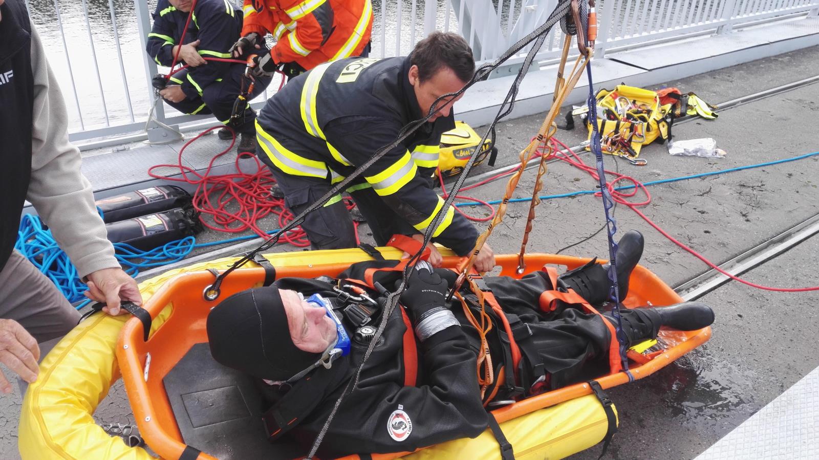 České Budějovice a Jindřichův Hradec a členové potápěčské skupiny z českobudějovického územního odboru. Děvět lezců a osm hasičů-potápěčů trénovalo vzájemnou spolupráci při simulovém zásahu. Zkoušeli si záchranu zraněného potápěče, kterého z vody vytahovali na konstrukci mostu. Důraz cvičení byl kladen na transport zraněného a následnou práci s barokomorou.