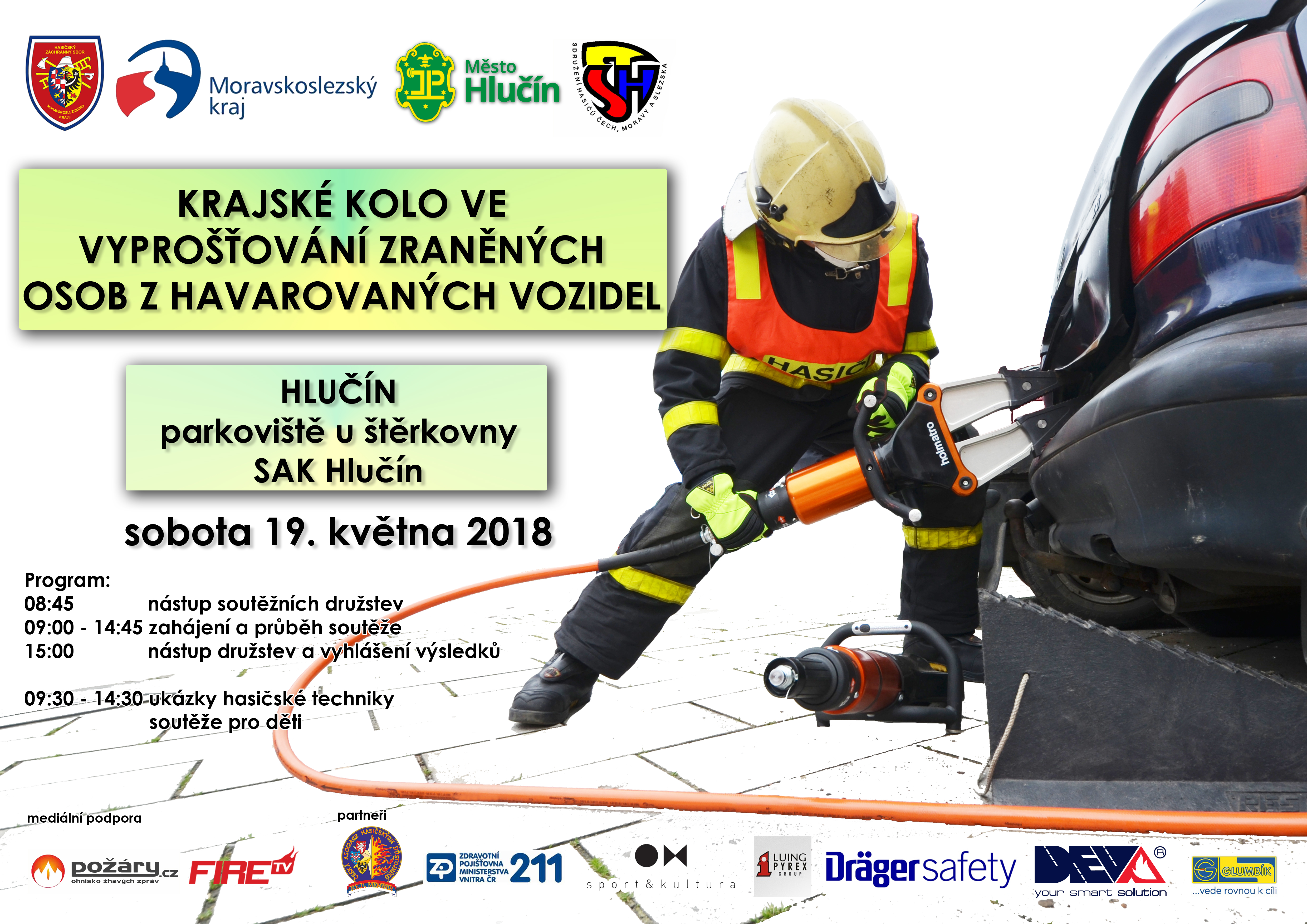 Šest nejlepších týmů profesionálních hasičů z HZS Moravskoslezského kraje a šest týmů dobrovolných hasičů z Moravskoslezského kraje se utká v sobotu 19.5.2018 v Hlučíně (okres Opava) - na parkovišti u zdejší štěrkovny - ve vyprošťování osob z havarovaných vozidel
