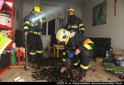Fotografie pořízená pražskými hasiči dne 24. 12. 2017. Škody způsobené požárem stromečku.