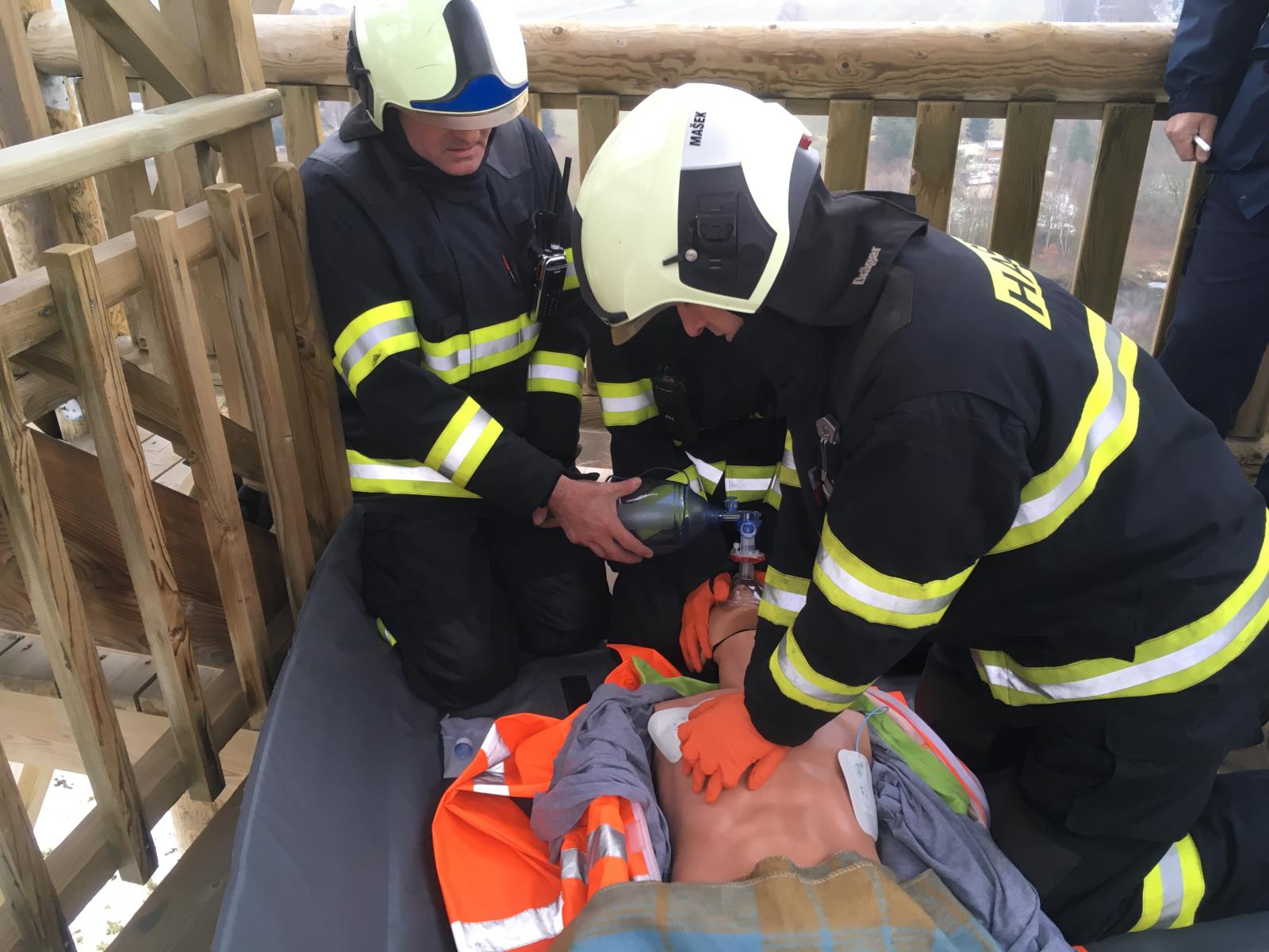 Pro ověření správného postupu při resuscitaci a použití defibrilátoru použili hasiči figurínu. Možnosti transportu zraněného zafixovaného na nosítkách pak už vyzkoušeli s jedním z kolegů.