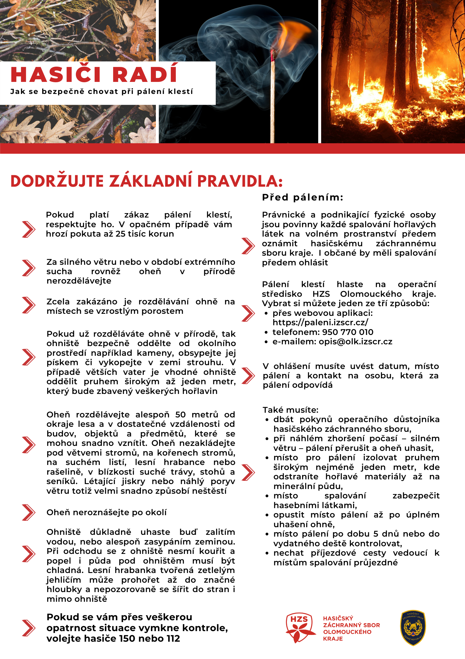 Vegetace je suchá, a proto hrozí zvýšené nebezpečí vzniku požáru a jeho rychlé šíření do okolí. Vypalování suché trávy v mnoha případech zapříčinilo nejedno zranění. Buďte proto obezřetní a dodržujte tato základní pravidla: