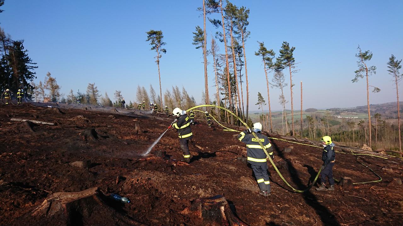 Druhý stupeň požárního poplachu u požáru lesa u Cizkrajova a další pondělní požáry lesní hrabanky