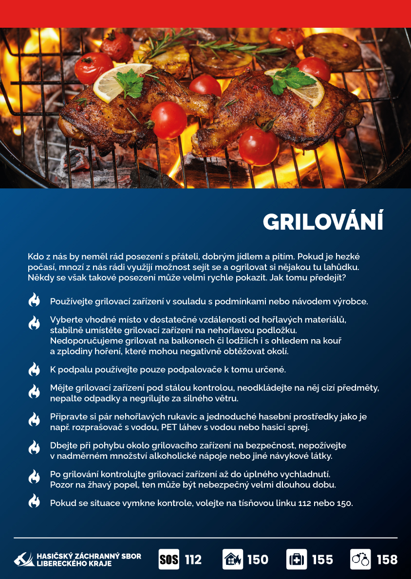 - Mějte u grilovacího zařízení v pohotovosti pár nehořlavých rukavic a jednoduché hasební prostředky, jako jsou např. rozprašovač s vodou, PET láhev s vodou nebo hasicí sprej.