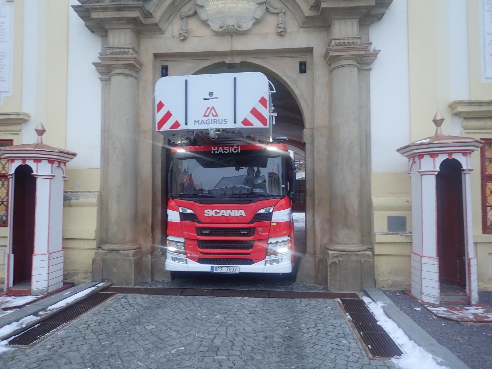 Průjezd výškové techniky hlavní vstupní bránou arcibiskupského zámku