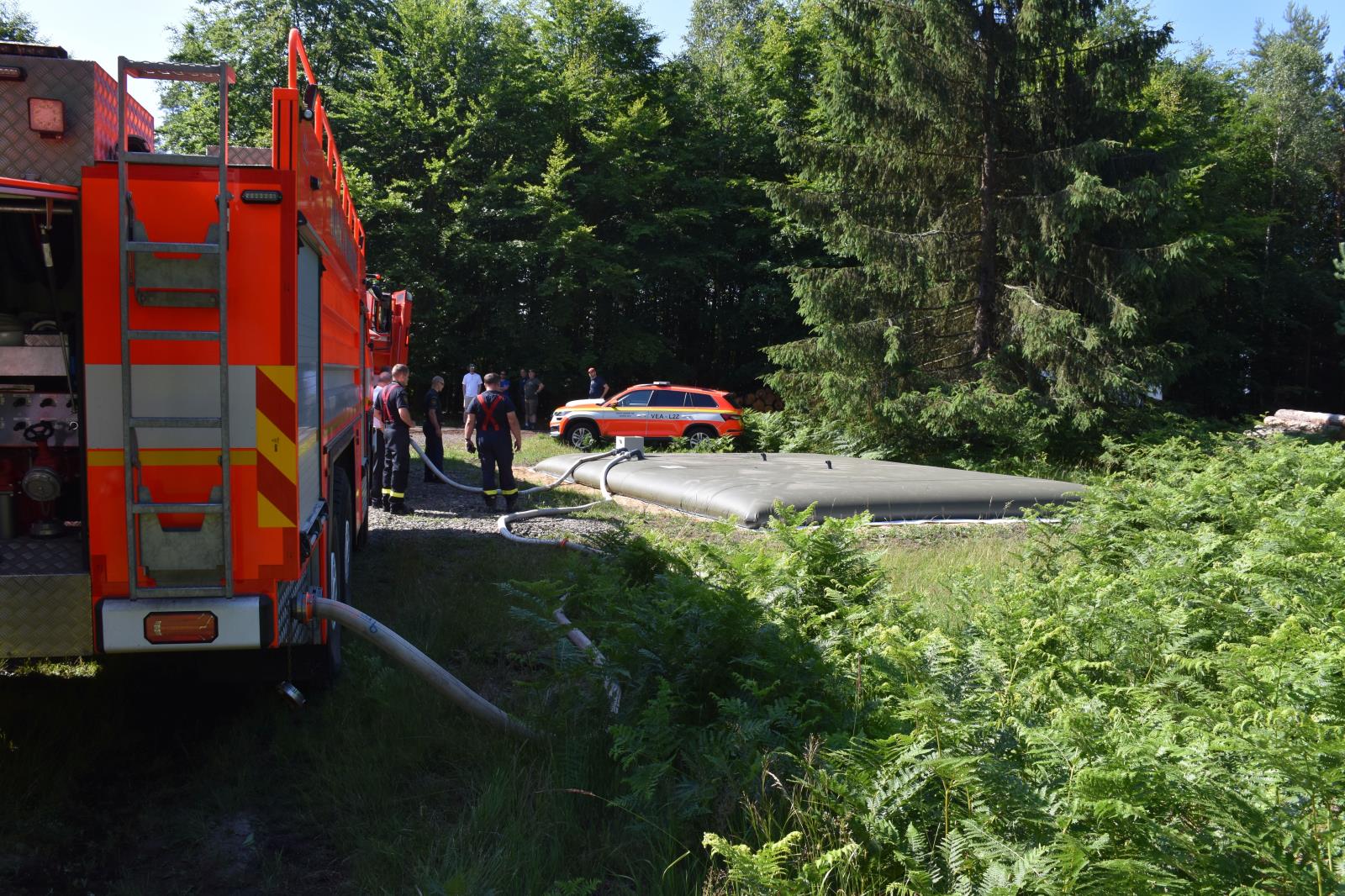 26. 6. 2023 Dnes jsme v Zadní Doubici plnili první vak na hasební vodu. Těchto vaků má být 12 postupně rozmístěno v Národním parku České Švýcarsko. Vak pojme 50 tisíc litrů vody, což je zhruba pět automobilových cisteren. V tomto týdnu mají být rozmístěny tři takové. Voda bude připravena pro prvotní hašení lesního požáru, než bude na místo dopravena další. Ve spolupráci s HZS byla vytipována místa, kde by hrozil nedostatek vody.