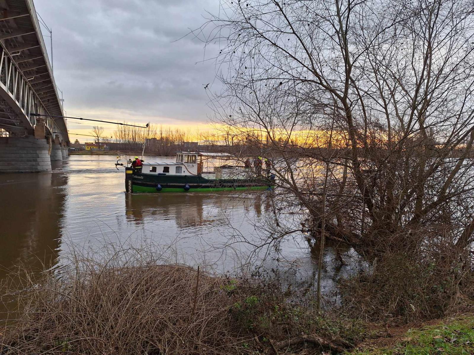 30.12. 2023 Dnes v 16:29 jsme ve spolupráci s policejními potápěči vyprostili kajutovou loď, která před dvěma dny uvízla i s částí mola pod Tyršovým mostem v Litoměřicích. Loď bude kotvit u výletní lodi Florentýna. Část mola byla zatím ponechána na dně řeky.