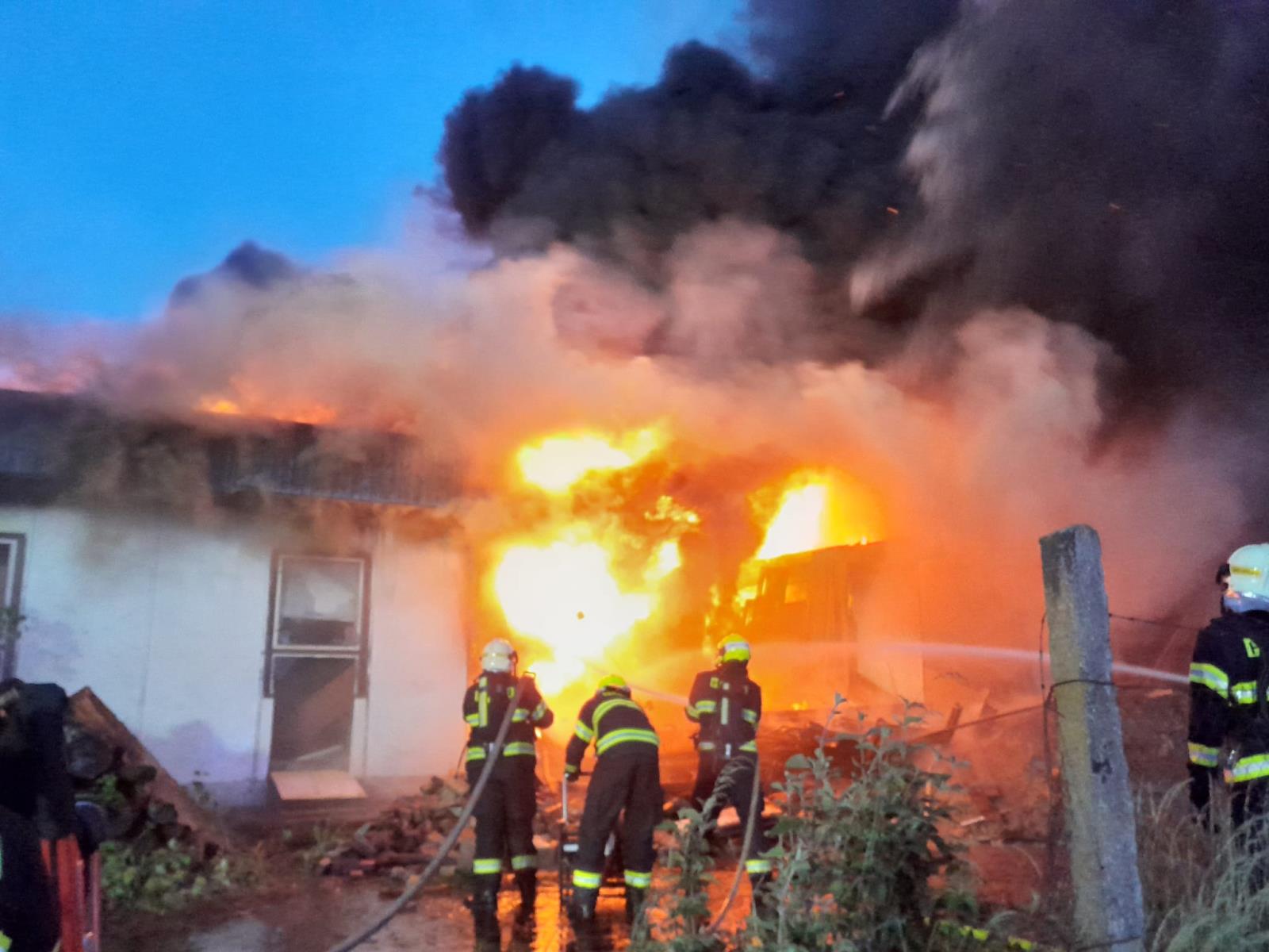 V 0:32 byl požár lokalizován. Probíhají dohašovací práce a likvidace objektu pásovým rypadlem ze Záchranného útvaru. zasahovalo celkem 12 jednotek.