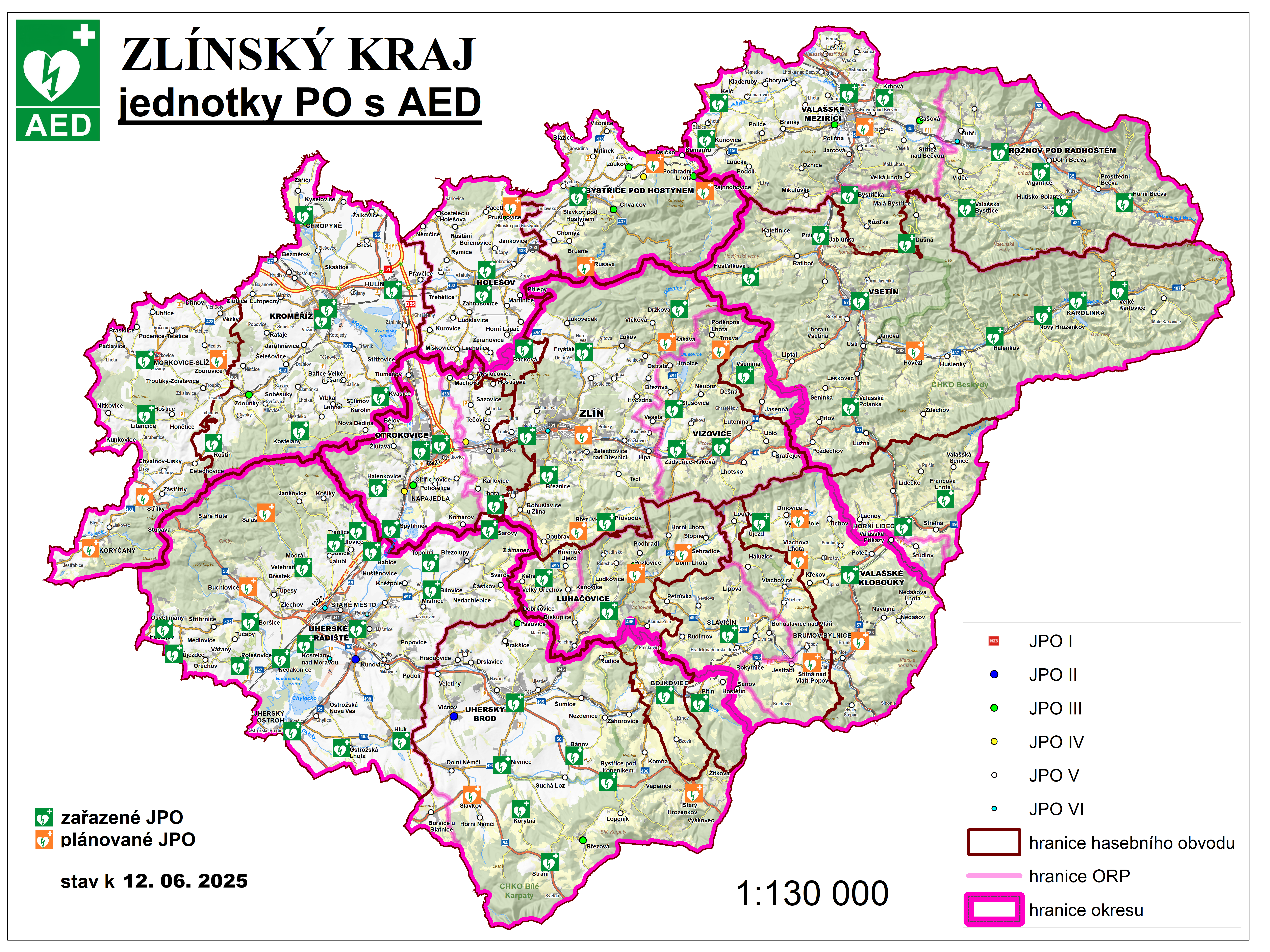 HZS Zlínského kraje prioritně podporuje pořízení AED u jednotek SDH obcí dle přiložené tabulky na základě rovnoměrného plošného pokrytí AED