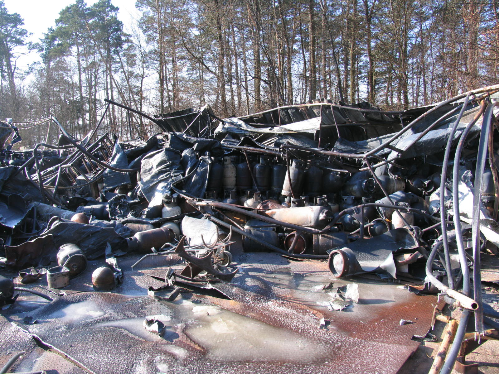 fotografie: výbuch tlakových láhví ve firmě Tomegas a výbuch tlakové láhve v bytovém domě v Českých Budějovicích)