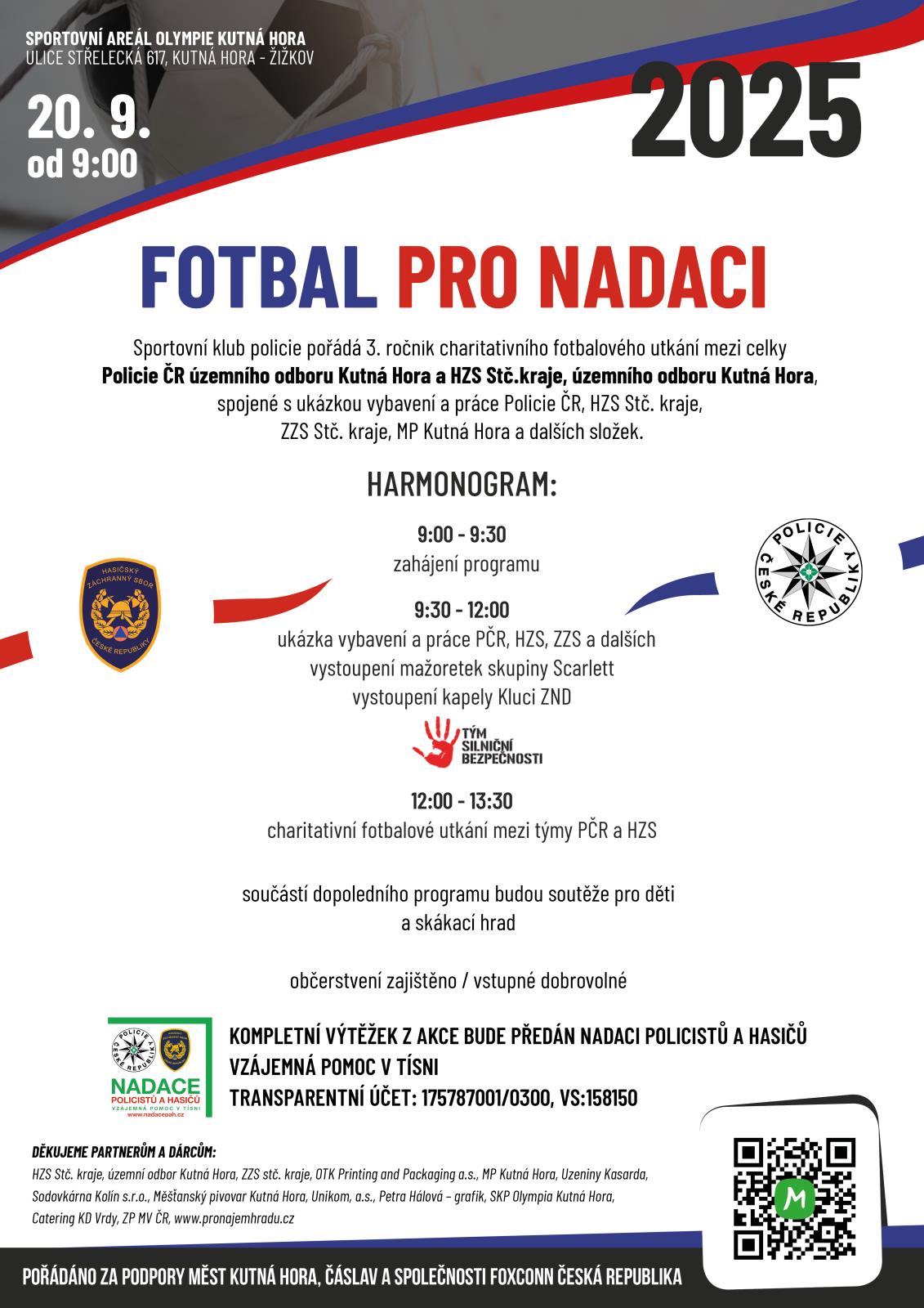 Sportovní klub policie pořádá 3. ročník charitativního fotbalového utkání mezi celky Policie ČR územního odboru Kutná Hora a HZS Středočeského kraje, územního odboru Kutná Hora, spojeného s ukázkou vybavení a práce Policie ČR, HZS Středočeského kraje, ZZS Středočeského kraje, MP Kutná Hora a dalších složek.
