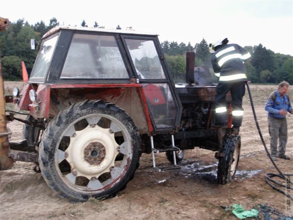 Požár traktoru na poli u obce Ochoz na Prostějovsku.