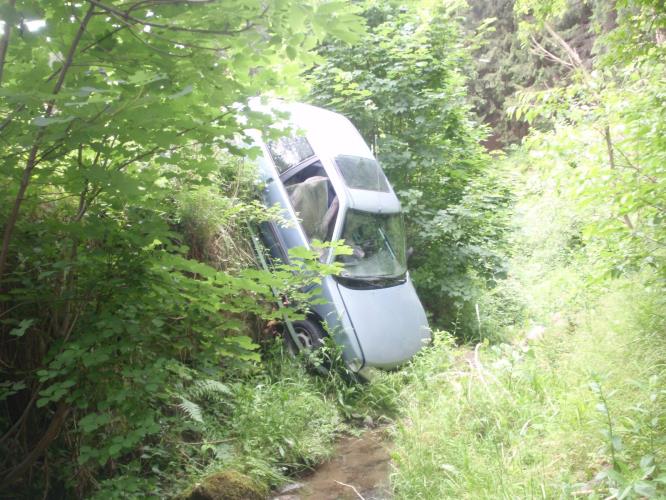Osobní vozidlo zůstalo zachyceno na zábradlí mostku.