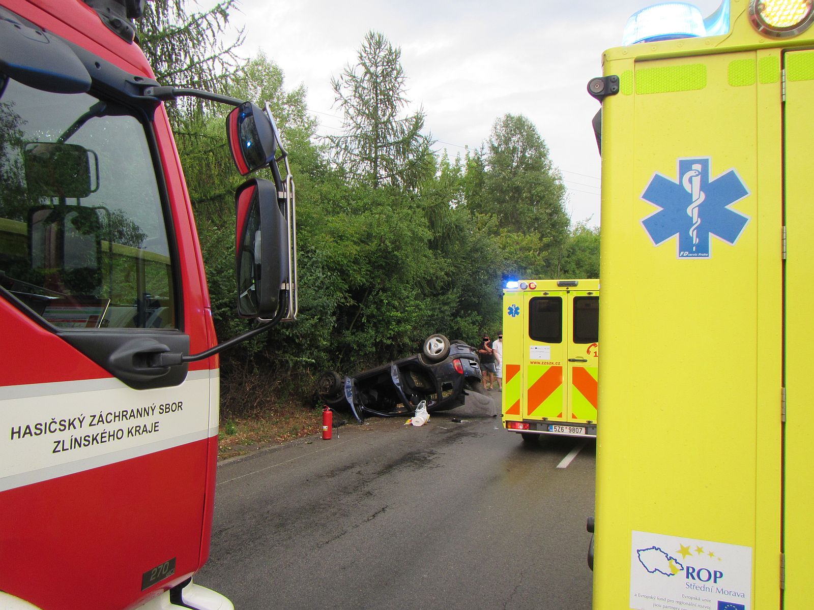 Osobní vozidlo na střeše. Tři zranění v péči záchranářů