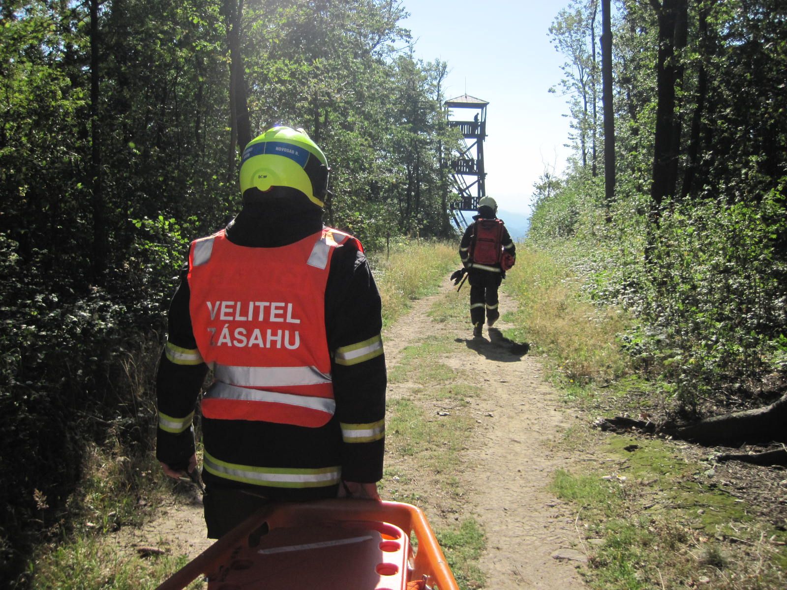 Před snesením z rozhledny poskytli hasiči zraněnému první pomoc