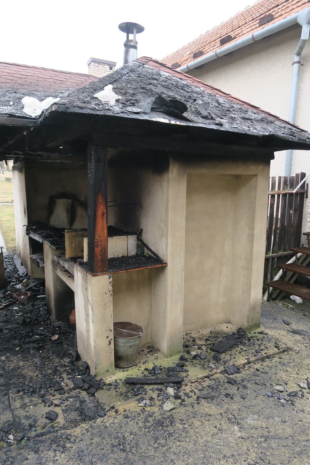 V Pitíně požár poškodil střechu udírny s přístřeškem.