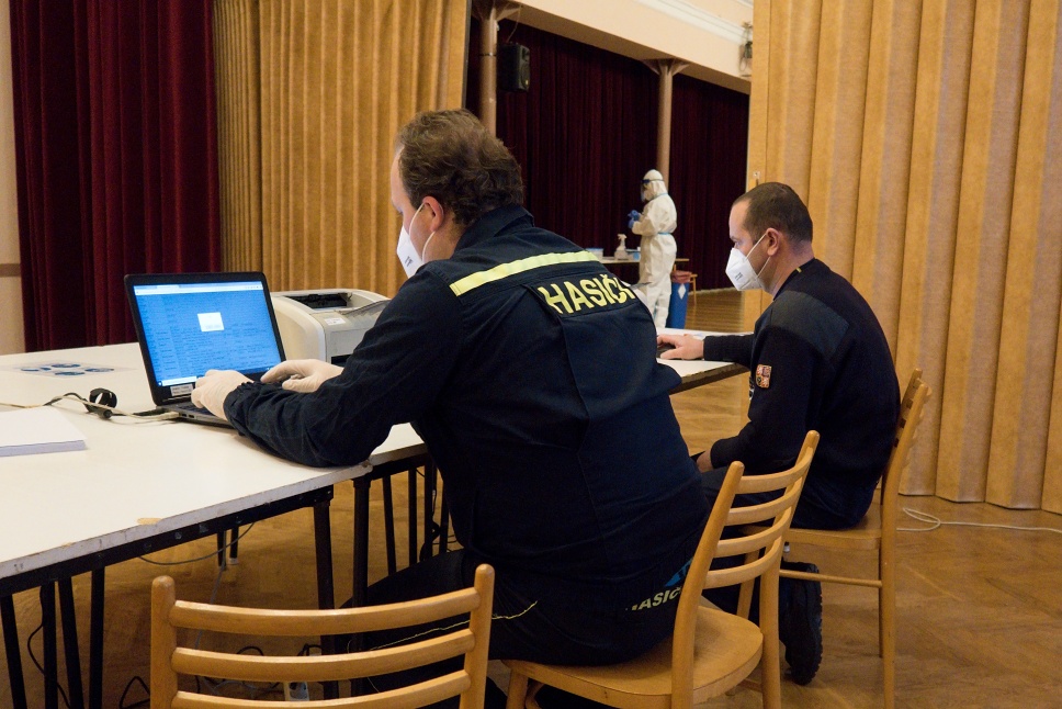 evidence příchozích.jpg hasič v obleku.jpg odběr.jpg odběrové místo v sále Společenského domu.jpg odběrové místo.jpg pokyny před vstupem.jpg