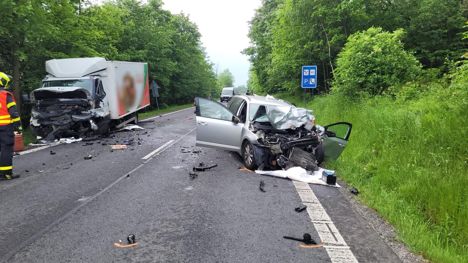 Při střetu osobního a nákladního vozu museli hasiči vyprostit jednoho z řidičů, na místě události přistál i vrtulník