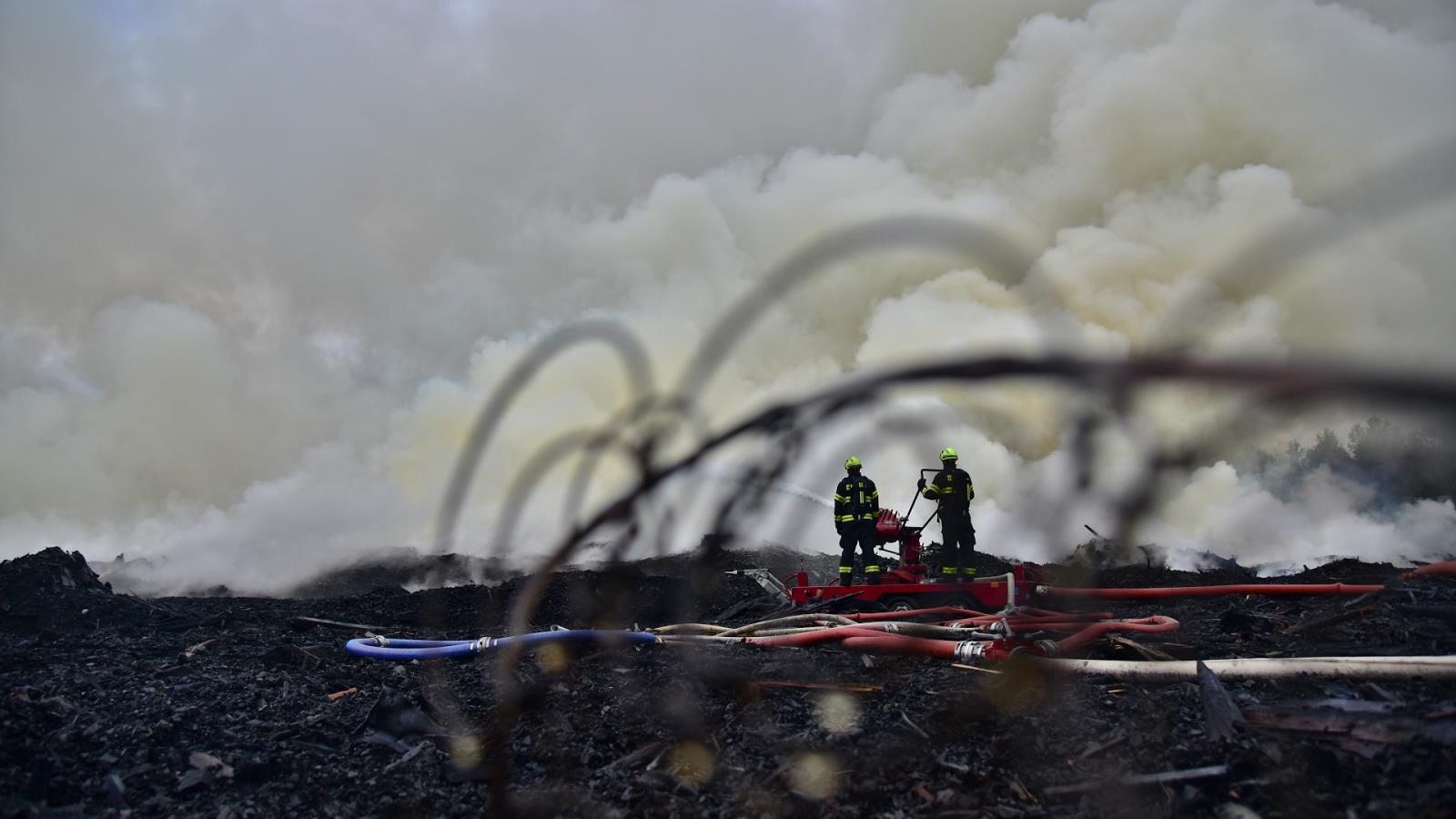 Požár skládky pražců v Tisové
