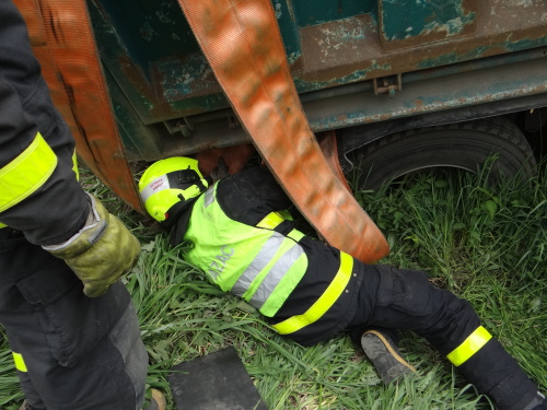 Hasičský jeřáb vyprošťoval Tatru s těžkým nákladem z příkopu v Kravařích