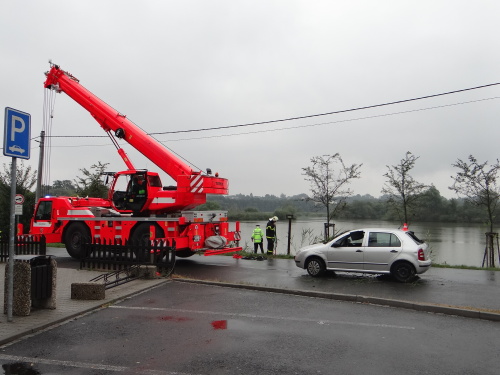 Vylovení fabie z rychvaldského rybníku pomocí jeřábu, opilý řidič se zachránil