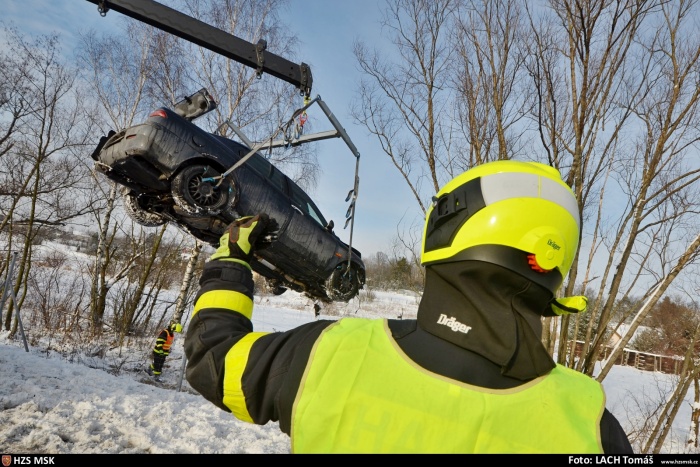 Hasiči překládali dlouhé tyče na dálnici a vytahovali sypač i Alfu Romeo