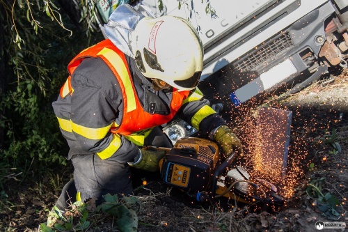 Iveco ve svodidlech v Bravanticích, hasiči čerpali naftu a řezali svodidla