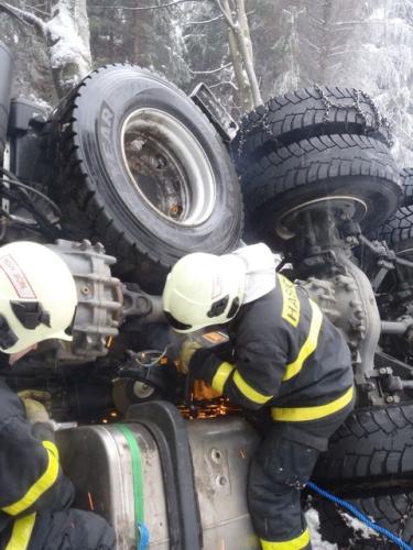 Dopolední zásah hasičů u dopravní nehody nákladního automobilu s kládami ve Veřovicích, okr. Nový Jičín