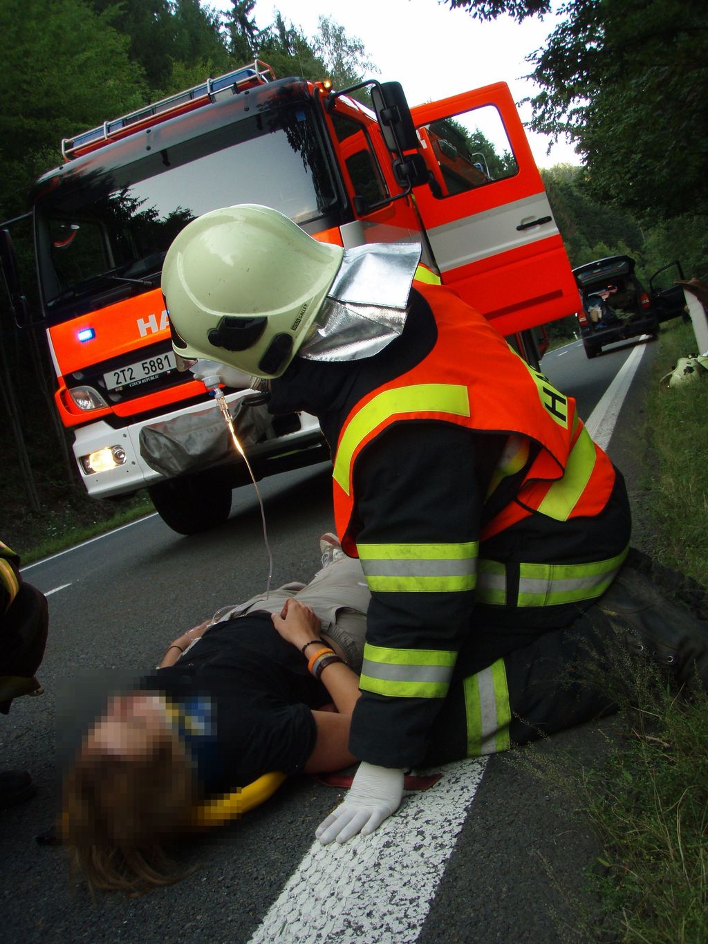 Společný zásah hasičů Moravskoslezského a Olomouckého kraje u dopravní nehody u Heltinova (okr. Nový Jičín)