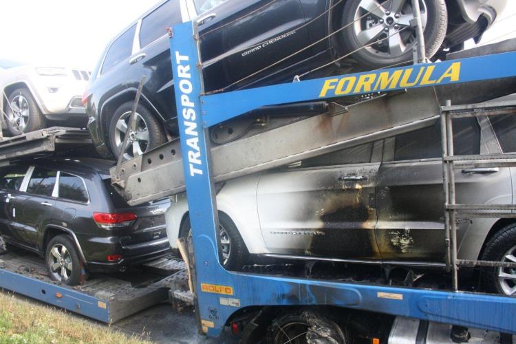 Požár kamionu převážejícího osobní auta na dálnici D8