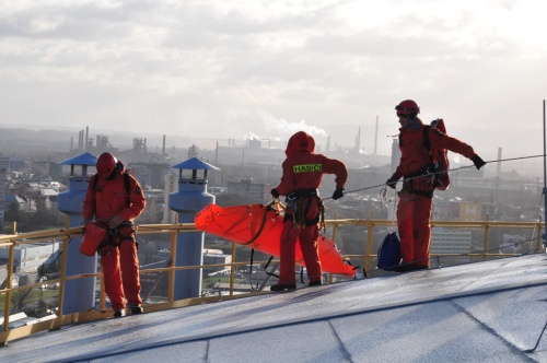 Hasičští lezci z Ostravy zachraňovali osobu z vysokého plynojemu, pak zasahovali na střechách v Ostravě