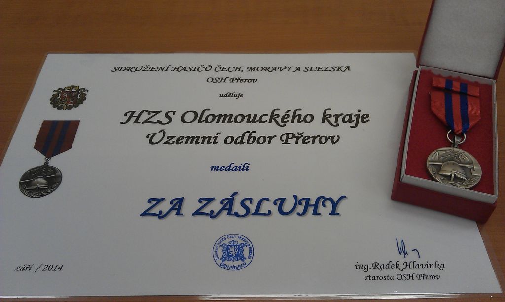 HZS OLK ÚO Přerov obdržel medaili SH ČMS "Za zásluhy"