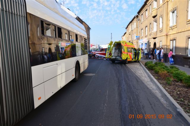 Dopravní nehoda dvou osobních aut a městkého autobusu v Chomutově.