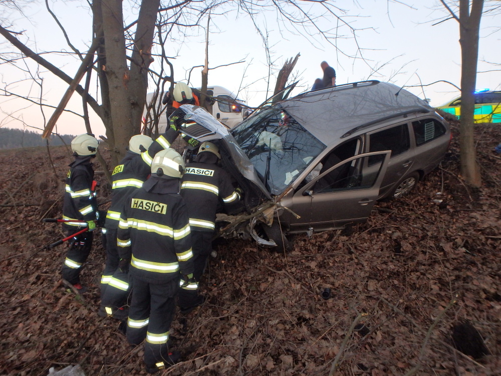 Vůz skončil po nehodě zaklíněn mezi stromy