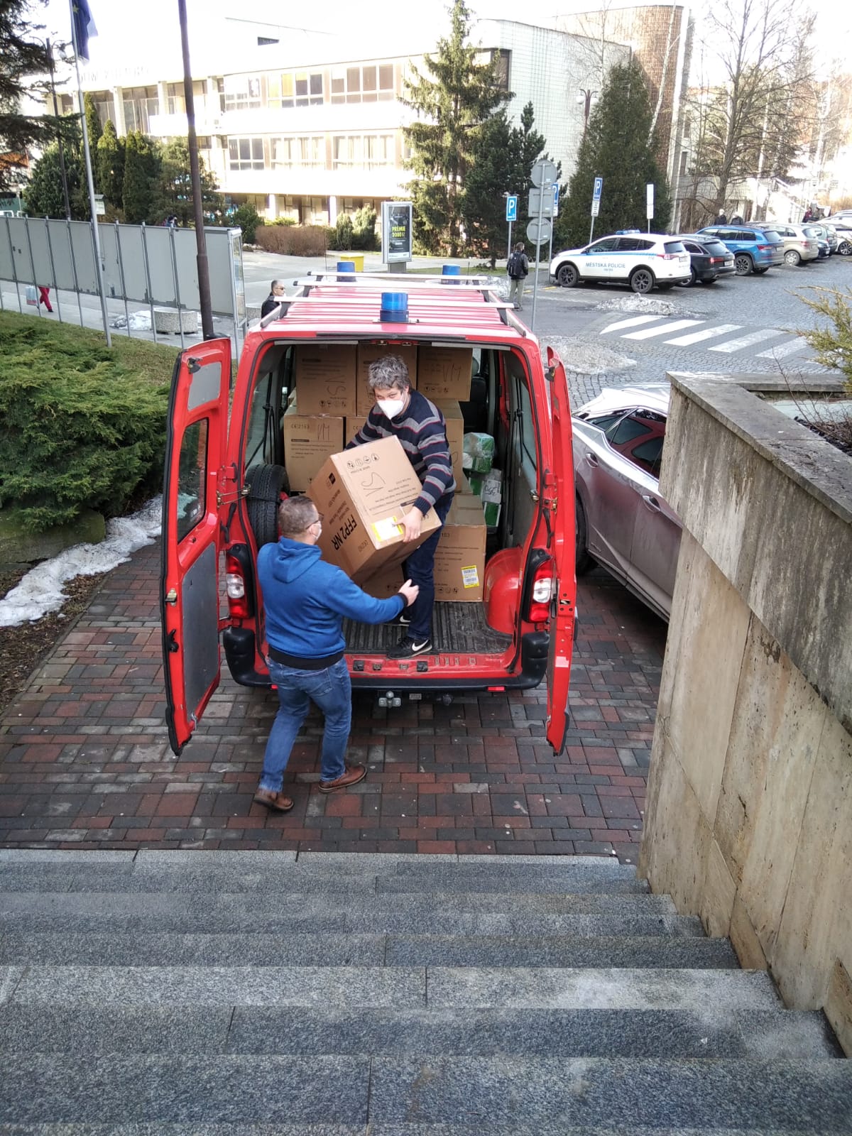 Hasičská vozidla plná respirátorů